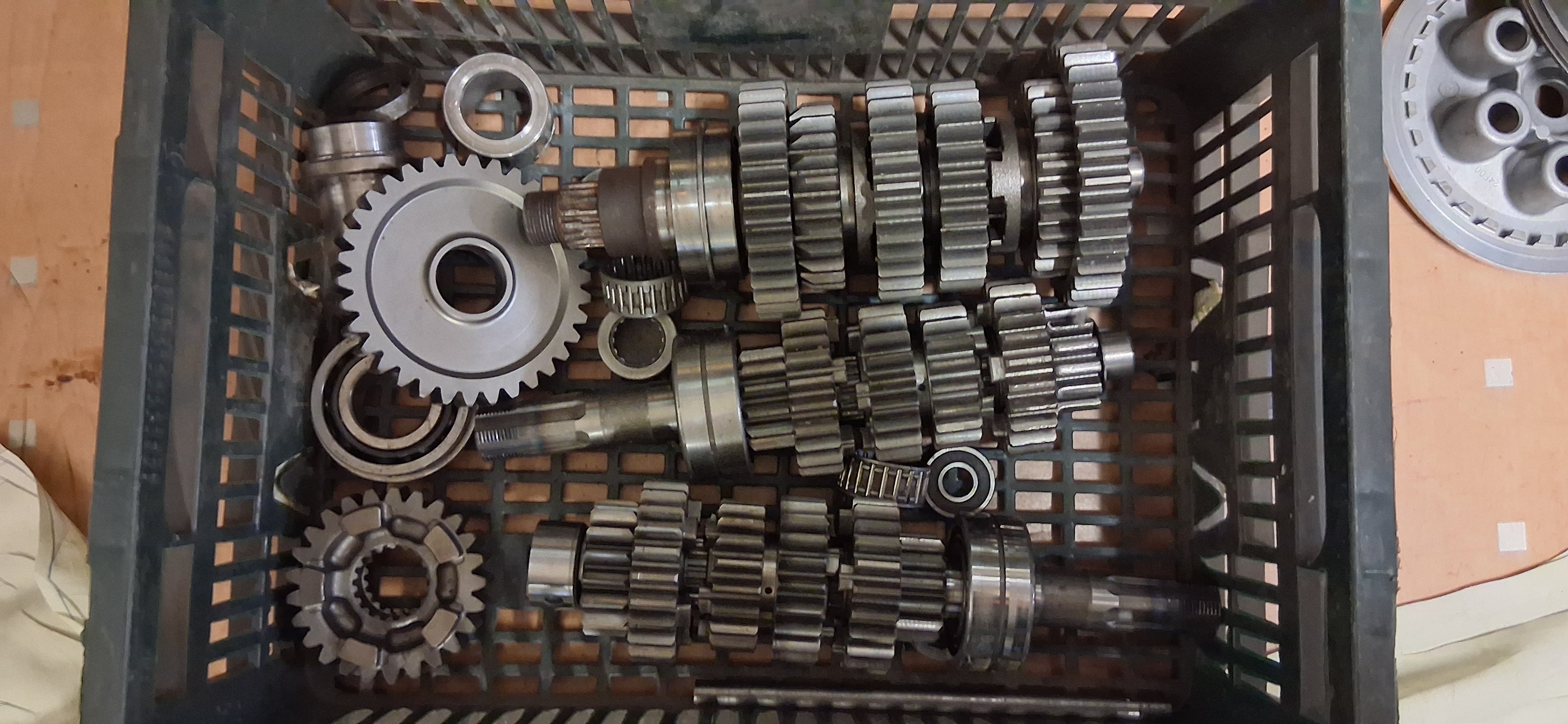 - 1 arbre primaire en bon etat ,1 arbre primaire avec canelure du pignon légèrement abîmé , 2 arbres secondaire en bon etat et diverses pignon/crabot. 300 euros ( attention sur la photo tous les crabots ne sont pas en bon etat )